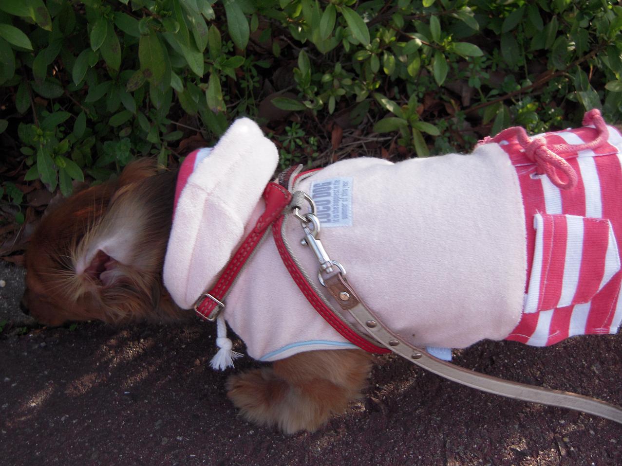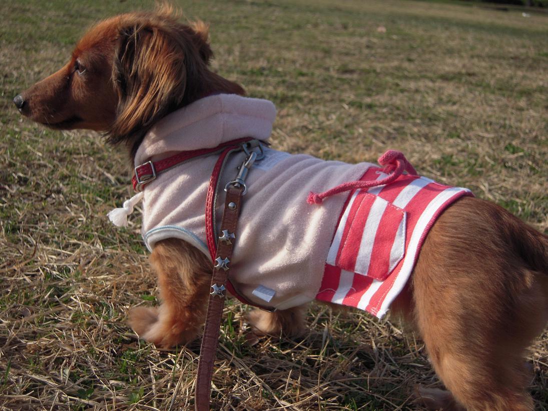しお母さんがたまたま買った(多分チワワ用の服)を、おなか部分でスカートをはくひなぎくのスタイルだってありなのです。